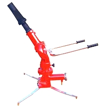 移动式泡沫炮是一种轻便的泡沫灭火设备,炮身可作水平回转、俯仰转动,可实现定位锁紧,并可折叠,存放空间小。通常配备在消防车上能供给泡沫混合液的消防泵上,或者运用自吸液;它适用于消防车不能进入的火场,在火场上可以根据火势情况移动位置,喷射泡沫或水扑救火灾; 该炮可以用两条65水带与消防车或固定消防泵相连接。